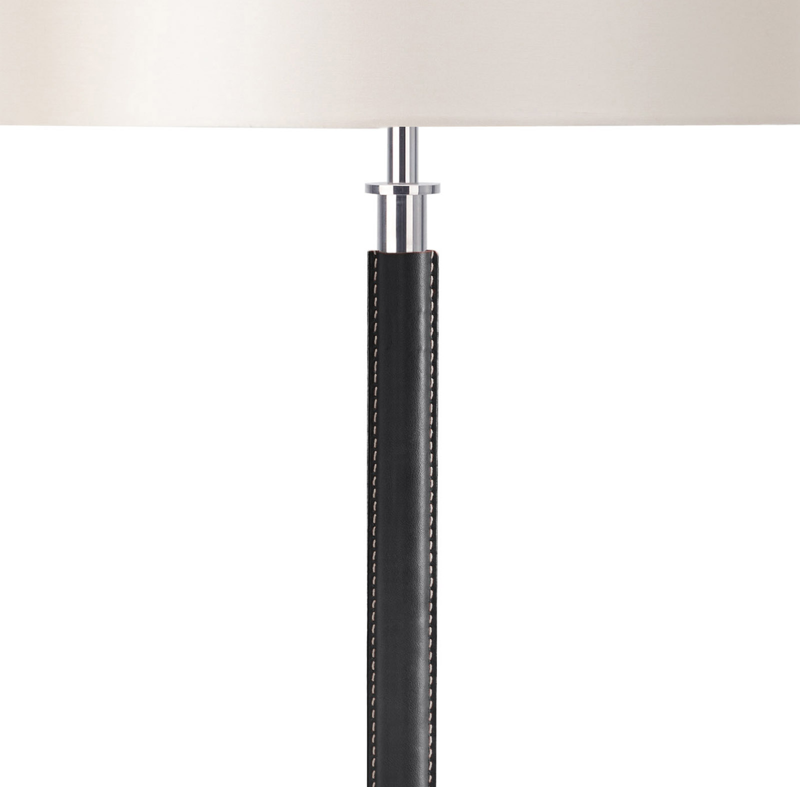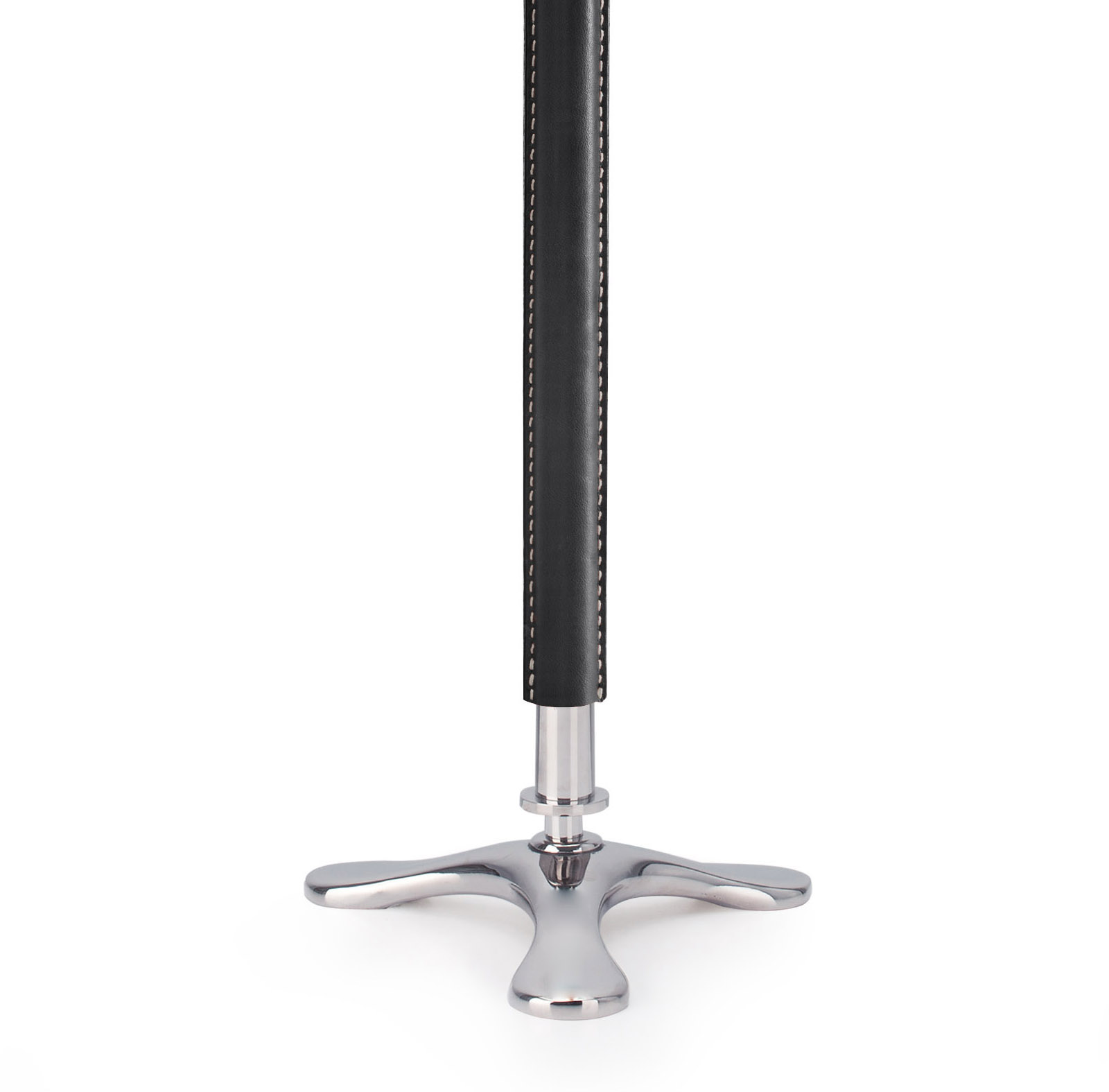 Designed by Adrien Bonaventure, the tripod has a cast base with three legs inspired by a boomerang and is available as a table or floor lamp. The leather is natural vegetable tanned and saddle stitched in the Welsh mountains. It comes in six standard colours and its edges are burnished to match. Leather & stitch colours can be customised.